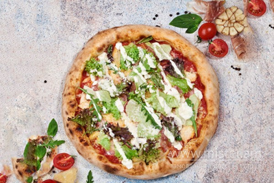 Соус з італійських томатів “Mutti”, бекон, куряче філе, мікс-салат, сири пармезан, моцарела та соус Цезаре.