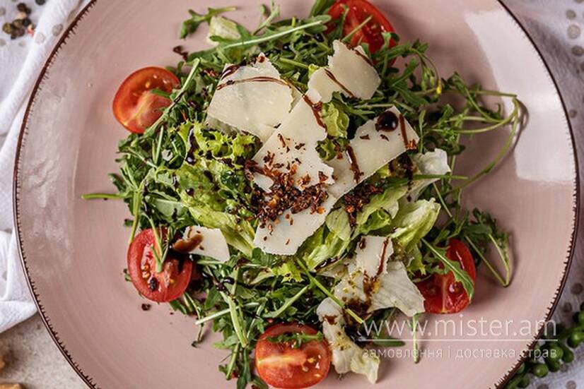 Пармезан, помідори чері, рукола, заправка на оливковій олії з травами.