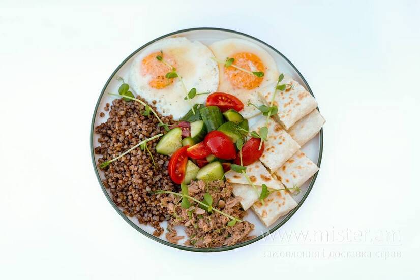 Гречка в поєднанні з вершковим маслом, маринований тунець з петрушкою, оката яєчня з пармезаном, свіжі огірки й томати з оливковою олією та чорним перцем, хрусткий лаваш з тягучою моцарелою і мікрогріном зверху. Ситно, ніжно, свіжо!