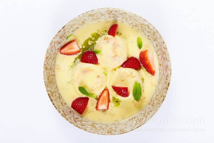 Томлені сирники з кремом каталана, ніжним згущеним молоком, соковитою полуницею. Посипаємо хрустким фундуком і прикрашаємо свіжою м`ятою.