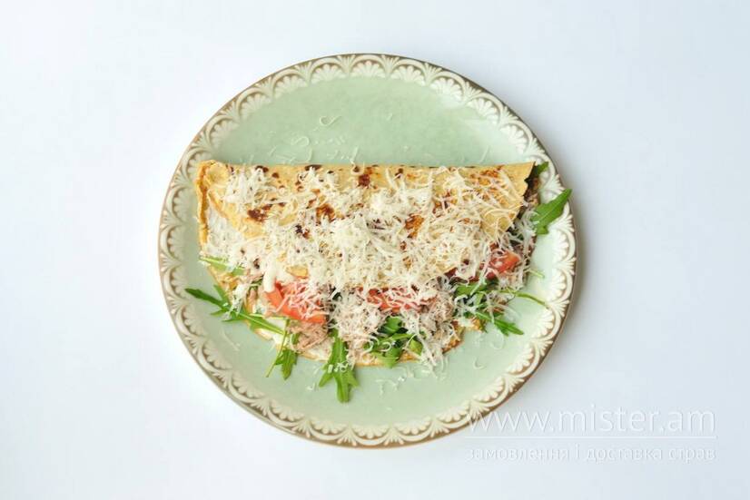 Легкий вівсяний млинець із крем-сиром, свіжою руколою, маринованим тунцем і томатами, довповнений ніжним соусом тонато та посипаний пармезаном.