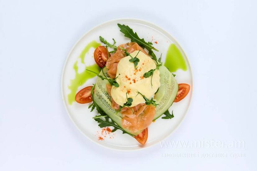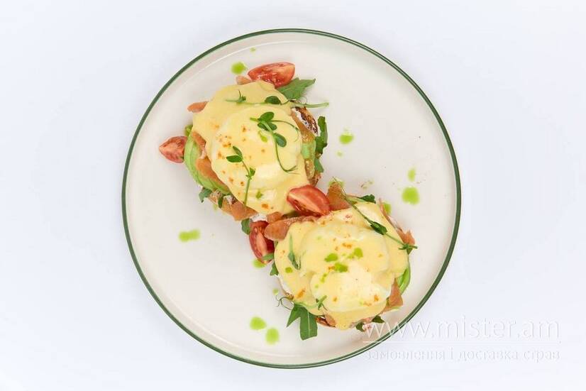 Підсмажена булка з крем-сиром, руколою та ніжним лососем, доповнена яйцем із рідким жовтком, чері та соусом голандез. Завершують смак копчена паприка, зелена олія й мікрогрін.