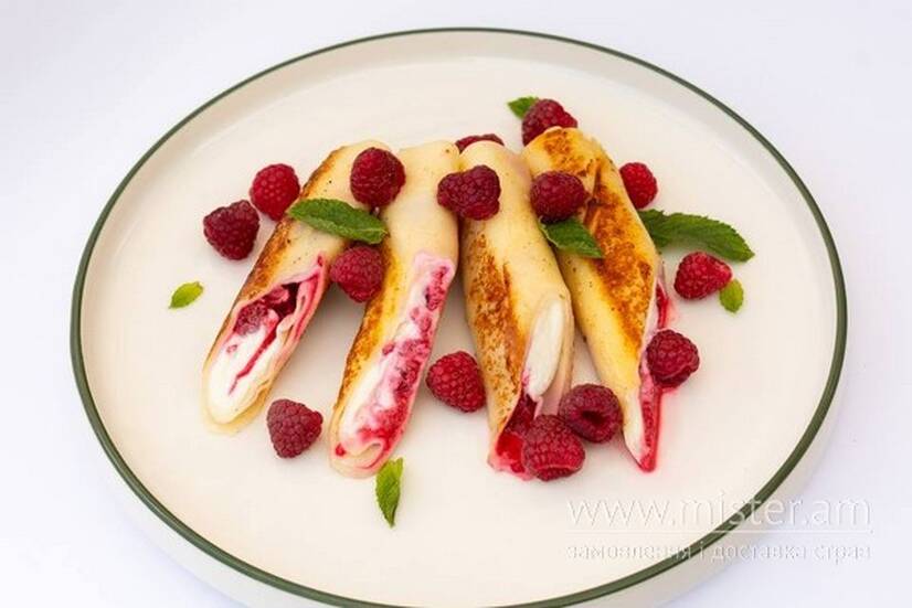 Тонкі млинці з ніжною начинкою з крем-сиру, доповнені соковитою малиною. Легкий десерт з яскравим ягідно-вершковим смаком.