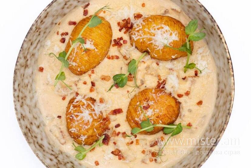 Ніжна молода картопля в соусі на основі пармезану та яєць. Подається з хрумким обсмаженим бочком, чіпсами з бекону та свіжим мікрогріном.