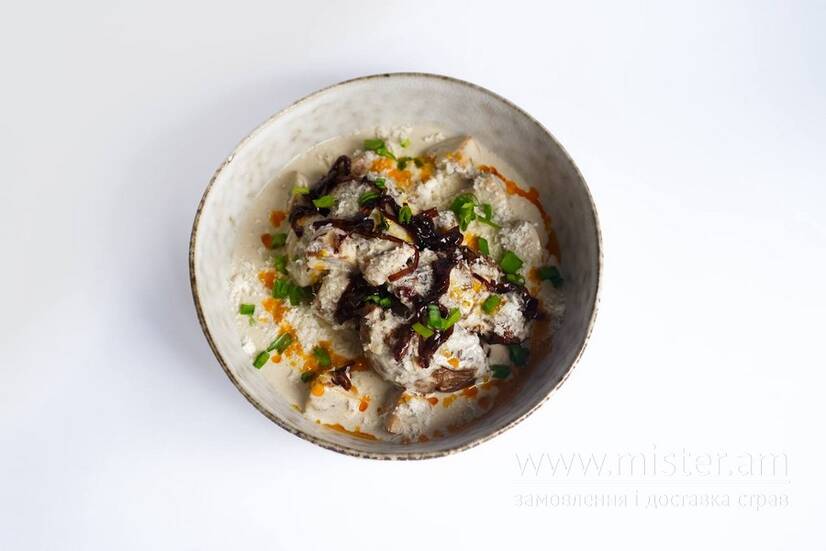Золотиста картопля з печерицями у ніжному вершково-грибному соусі, посипана пармезаном,доповнена карамелізованою цибулею. Завершуємо ароматною червоною олією та свіжою зеленою цибулею.