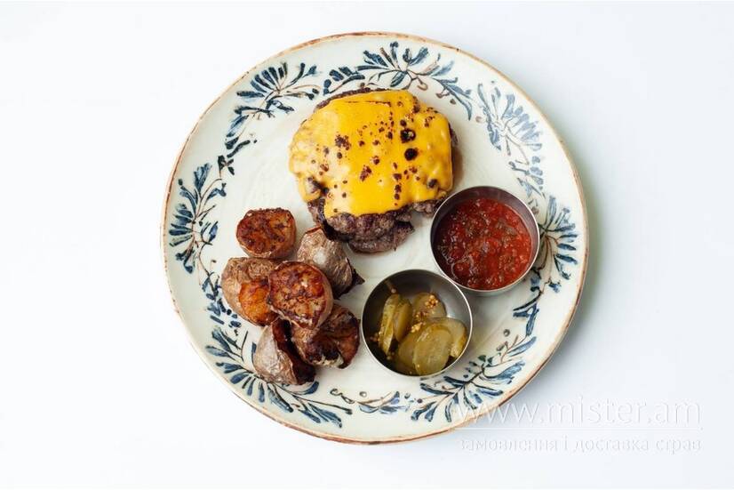 Соковита смеш-котлета з розплавленим чедером, подається з хрусткою молодою картоплею. Доповнюється маринованим огірком, ароматною часниковою олією та аджикою.