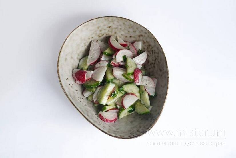 Свіжий овочевий салат із редискою, огірком та зеленою цибулею з ніжним соусом на основі грецького йогурту із зеленню та часником.