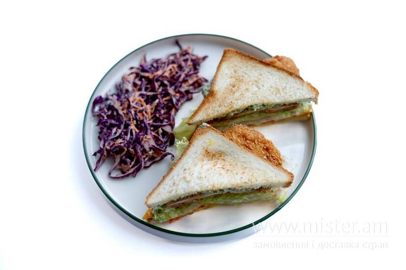 М`який тостовий хліб з рум`яним курячим шніцелем,тягучим сиром чедер та хрустким айзбергом. Доповнюємо ароматним зеленим маслом, пікантною американською гірчицею та соковитим жовтим помідором,подаємо разом з хрумкою синьою капустою та морквою.