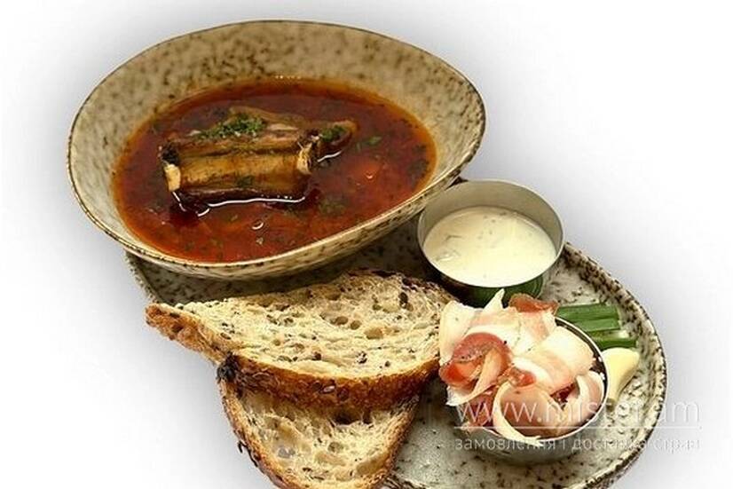 Ароматний, наваристий борщ із соковитим ребром, запашною паприкою, поживною квасолею, легкою вишневою кислинкою та копченою грушею, що надає ніжного димного присмаку й аромату. Подаємо з хрусткою зеленою цибулею, маринованим бочком, соусом на основі грецького йогурту, сметани та зелені, а також зі свіжим мультизерновим хлібом і запашним часником.