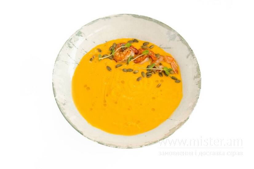 Ніжний гарбузовий суп з ароматом кориці й бадьяна, подається з маринованою креветкою, насінням гарбуза та краплею зеленого масла.