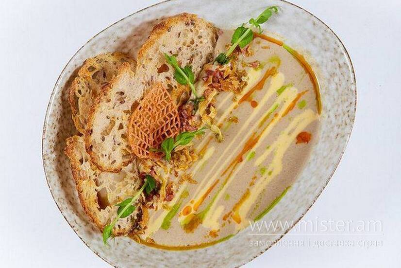 Ніжний суп на основі вершків та печериць з додаванням цибулі шалот, часнику, спецій та вершкового масла, подаємо разом з ароматним сирним соусом, крутонами і хрустким кранчем з бекону, цибулі, мікро зелені, зеленої та червоної олії.