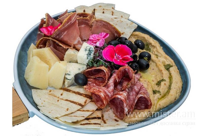Прошуто, салямі італійська, Дор Блю, Пармезан, маслини, грильована піта, хумус з Песто.