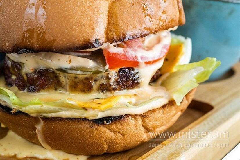 Булочка бріош, соус Цезар, соус BBQ, листя салату, сир тостовий, томати, цибуля , огірок, котлета яловича, фрі.
