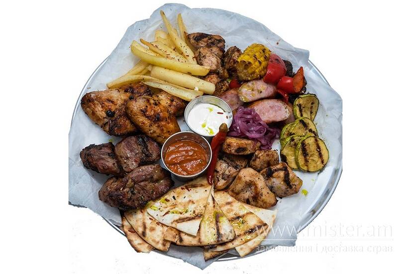 Шашлик зі свинного ошийка, шашлик курячий, шашлик з індички, крильця з хоспера, ковбаски грильовані, картопляні діпи, овочі гриль, соус BBQ, соус Пармезан.