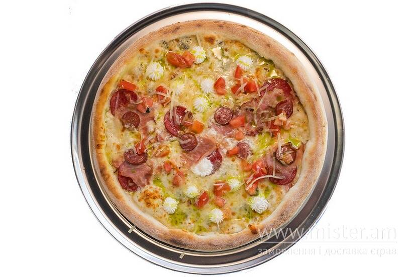 Піца візуально поділена на 4 сектори: 2 з них - 4 види м'яса, інші 2 - 4 види сиру.