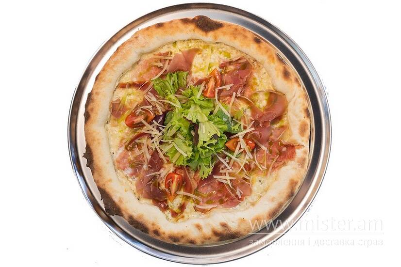 Сир твердий, шинка копчена, крем-сир в бортиках, томати Чері, мікс салату, зелена олія.