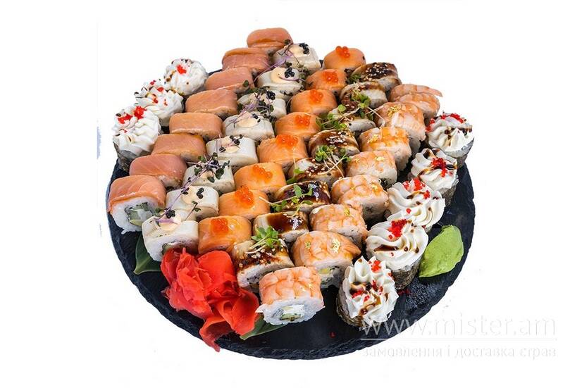 Філадельфія з вугрем, Філадельфія з лососем та ікрою, Філадельфія з копченим лососем, Філадельфія з креветкою, Філадельфія з білою рибою, футомакі з омлетом тамаго та вершковим сиром.