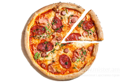 Томатний соус, сир, шинка, бекон, салямі, ковбаски, цибуля порей, зелень петрушка.