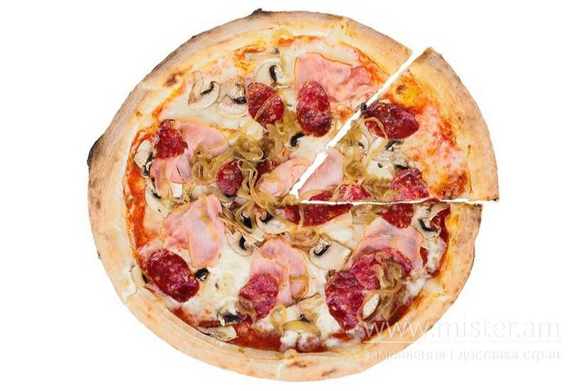 Томатний соус, сир, салямі, шинка, печериці свіжі, цибуля смажена, базилік сухий.
