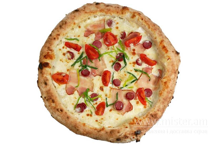 Вершки, сир, бочок, ковбаски мисливські, цибуля порей, помідори чері, соус часниковий (олія соняшникова, часник).