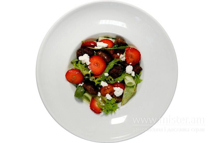 Мікс салатів, печінка куряча, полуниця свіжа, огірки свіжі, помідори чері, сир рікота, борошно пшеничне, крохмаль, олія соняшникова, соус (олія оливкова, пюре полуничне, оцет винний).