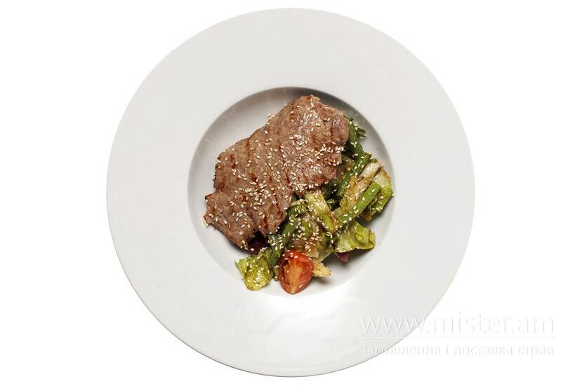 Філе телятини, квасоля стручкова, броколі, помідори чері, огірки, соус горіховий (горіхи грецькі, олія соняшникова, олія оливкова, оцет бальзамічний, сіль), мікс салатів, цибуля зелена, стебло селери, кунжут.