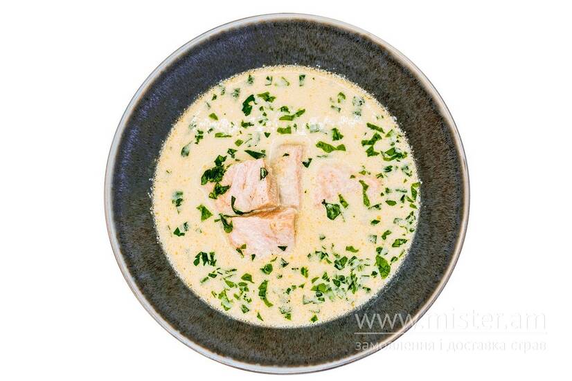 Філе лосося, картопля, корінь селери, морква, цибуля ріпчаста, молоко, вершки, зелень.