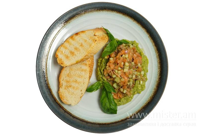 Філе лосося, огірок, авокадо, земля з оливок, базилік свіжий, хліб чіабата, цибуля синя, каперси, олія оливкова, соус соєвий, лимонний сік, часник.
