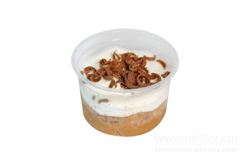 Бісквіт з апельсиновою цедрою, соус з трьох видів молока: згущене молоко сире, згущене молоко варене, молоко звичайне, крем з маскарпоне та вершками, посипаний шоколадними кучерями.