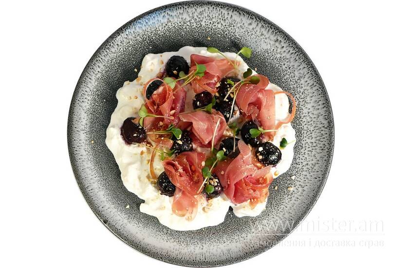 Cир бурата, виноград, шинка пармська, олія оливкова, оцет бальзамічний, горіхи кеш`ю, мікрозелень.