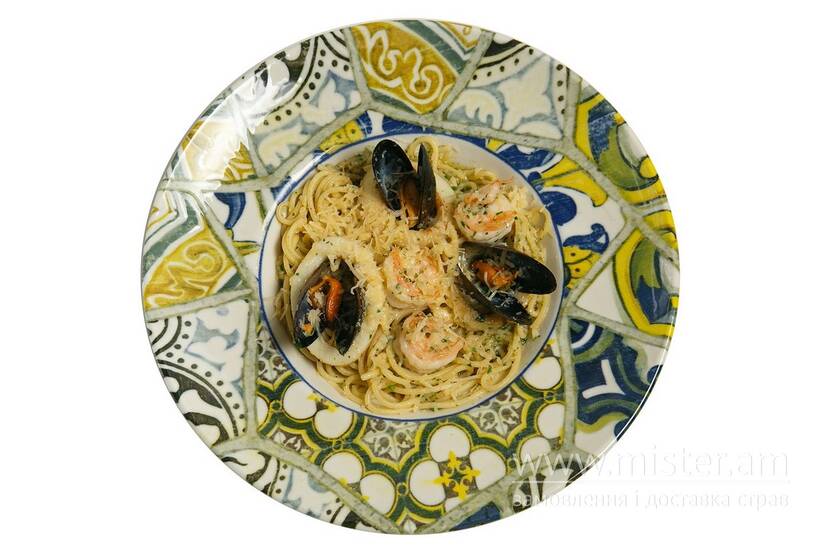 Cпагетті, креветки тигрові, кальмар, мідії в мушлях, оливкова олія, зелень, часник, приправа хондаші, суміш перців, лимон свіжий.