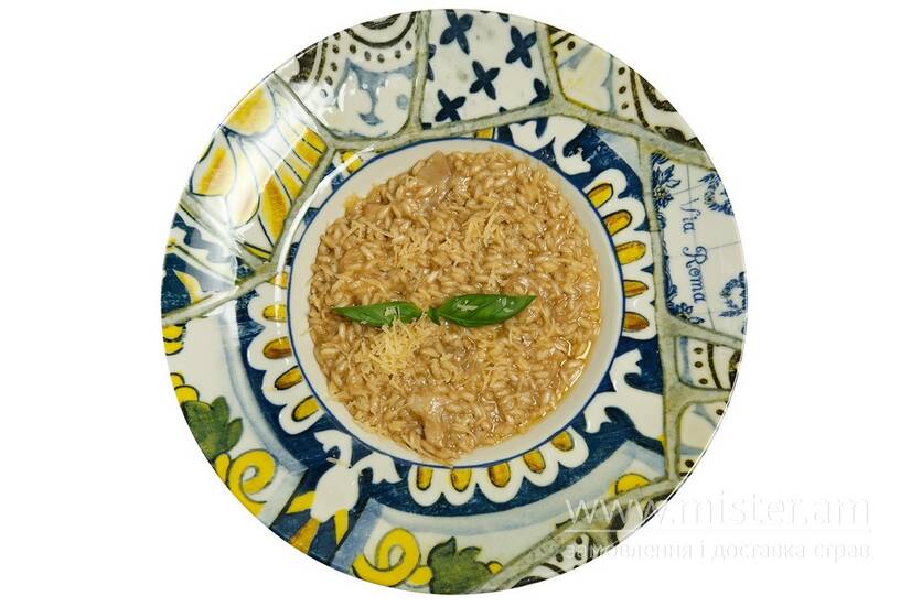 З соусом деміглас та пармезаном. Рис арборіо, гриби білі, соус деміглас, часник, сир пармезан, зелень.
