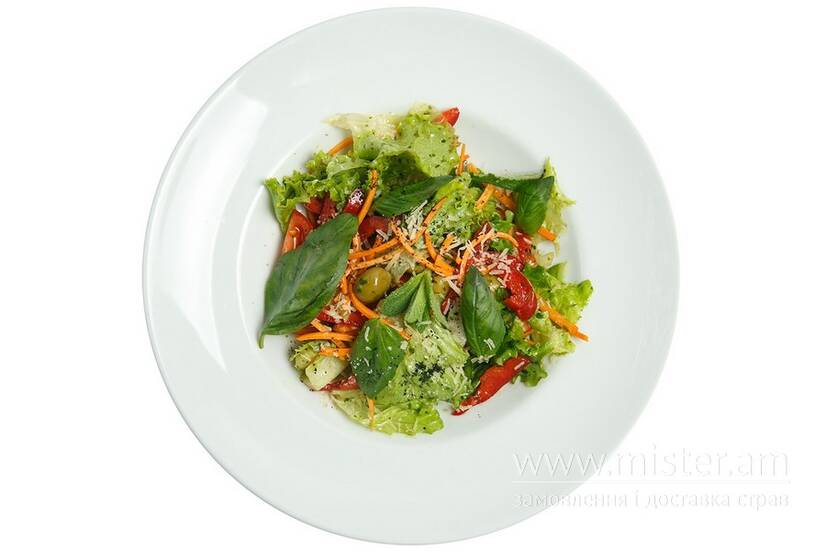 Мікс салатів, помідори чері, соус сальсаверде (зелень петрушка, часник, олія оливкова, олія соняшникова, сіль, перець), перець болгарський, оливки, морква, стебло селери, м'ята, базилік свіжий, сир пармезан, земля з оливок.