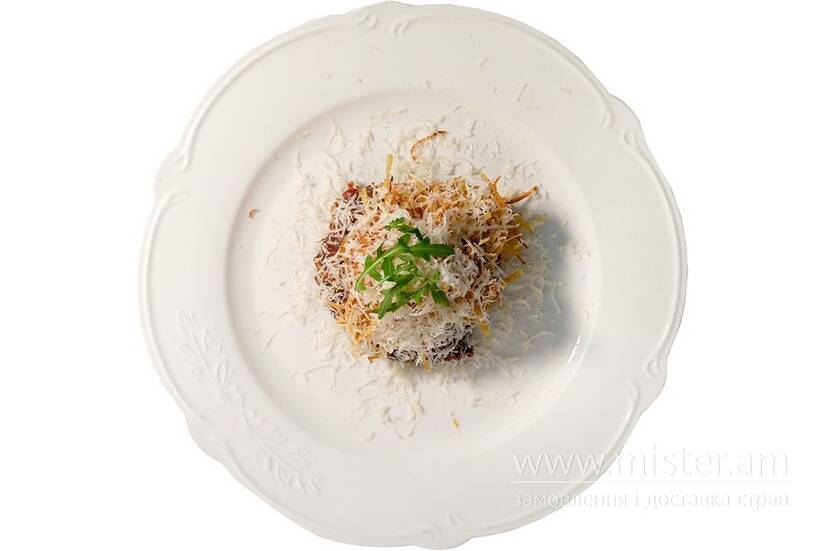Яловичина, каперси, огірки мариновані, анчоуси, цибуля, олія оливкова, паста трюфельна, яйце перепелине, картопля, сир пармезан, рукола.