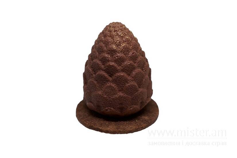 Сирний карамельний мус з кремовою текстурою та секретною начинкою, всередині під мусом сховане тістечко мурашник з пісочного тіста та згущеного молока, зовні десерт покритий шоколадним велюром.