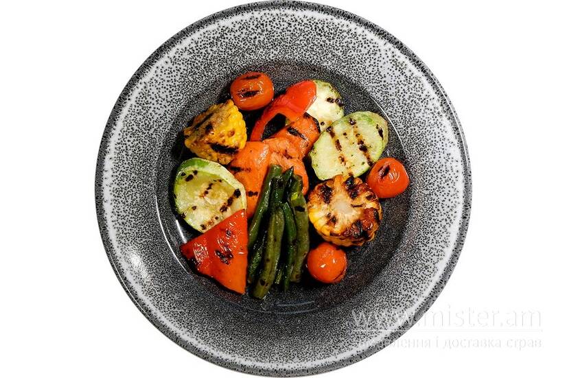 Перець болгарський, морква, помідори чері, квасоля стручкова, кабачки, кукурудза качан, часник, соус соєвий, олія оливкова, олія соняшникова.