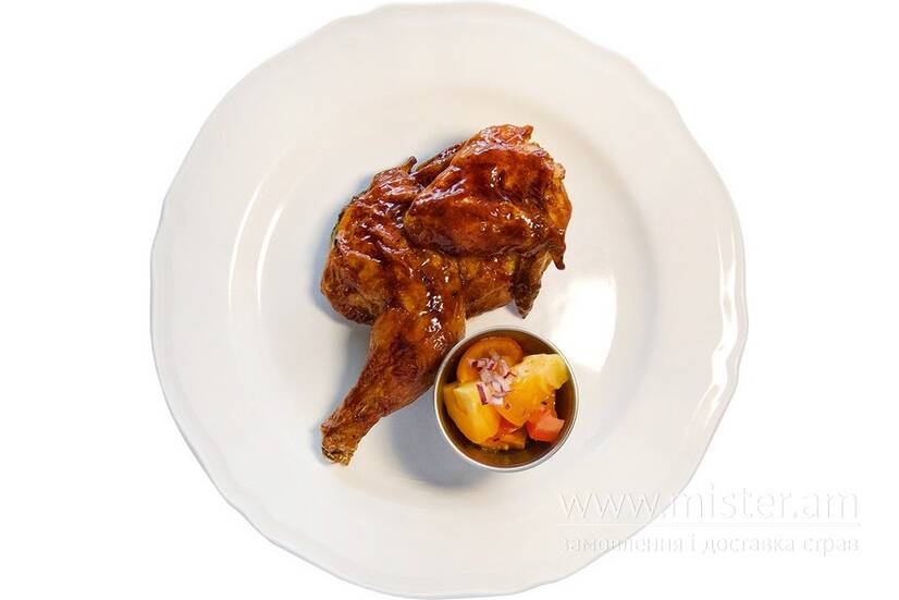 Курча кукурудзяне, глазур барбекю, помідори чері, цибуля, олія оливкова, оцет винний.