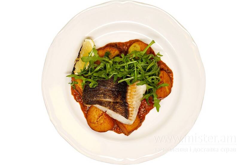 Палтус, печена картопля, соус ромеско на основі печеного перцю та томатів, рукола, лимон.