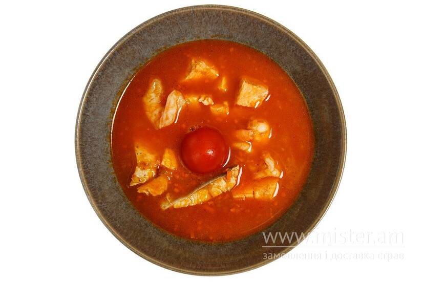 Креветка, лосось, форель, бульйон овочевий, томати консервовані, помідори чері, морква, цибуля ріпчаста, селера стебло, часник, вино, приправа хондаші, зелень.
