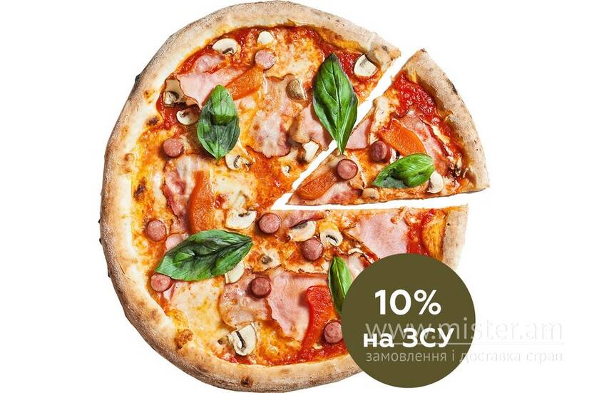 Томатний соус, сир, ковбаски мисливські, шинка свиняча копчена, печериці свіжі, бочок, перець болгарський, базилік свіжий.