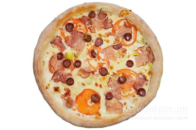 Вершки, сир, бочок, ковбаски мисливські, цибуля порей, помідори, соус часниковий (олія соняшникова, часник).