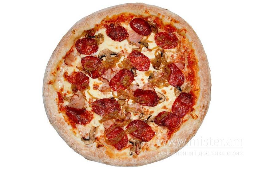 Томатний соус, сир, салямі, шинка, печериці свіжі, цибуля смажена, базилік сухий.