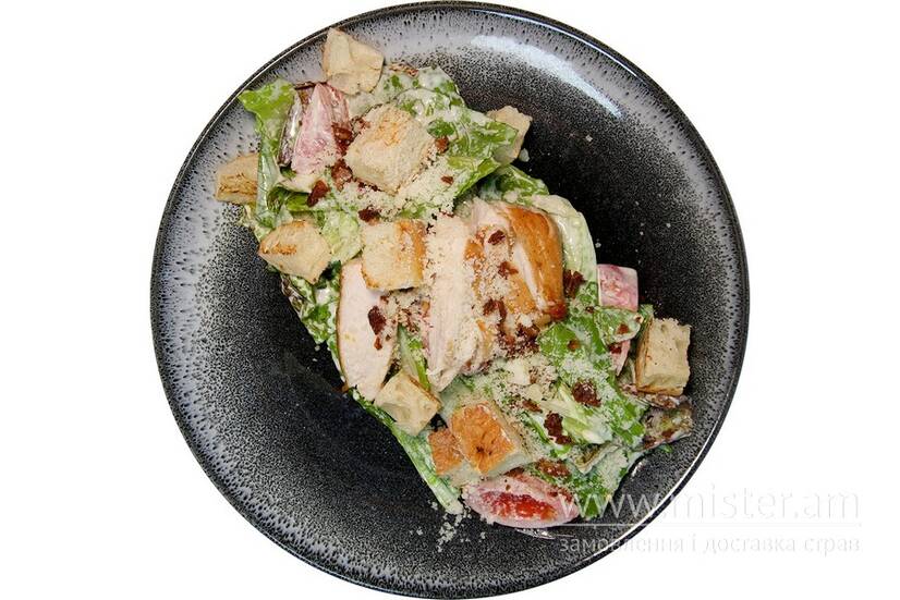 Філе курки, салат ромен, помідори чері, бекон, соус до цезаря, сир пармезан, крутони.
