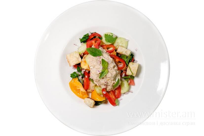 Діп з консервованого тунця, помідори чері, огірок, перець болгарський, цибуля марс, крутони, олія оливкова, зелень петрушки, базилік свіжий.