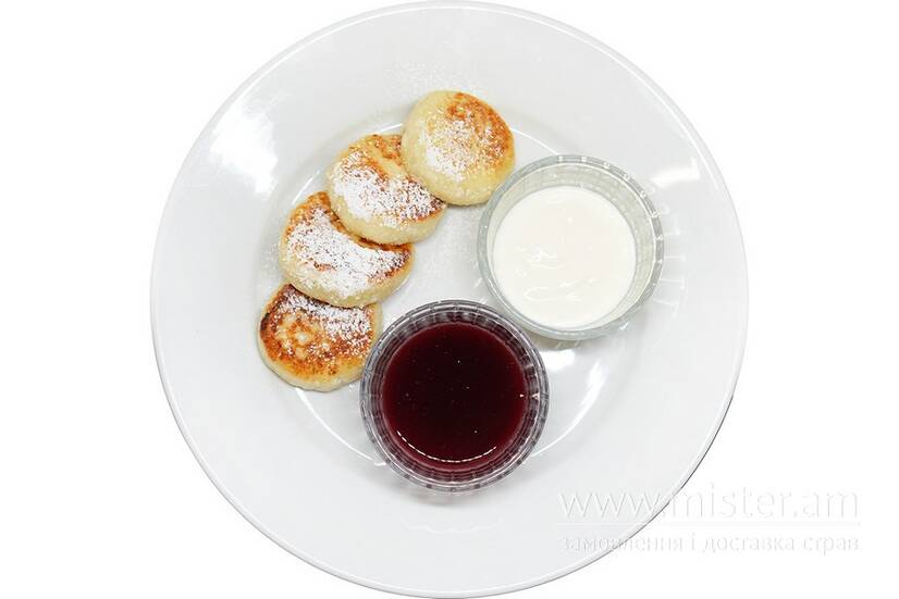 Сир творог, сметана, соус ягідний, м`ята, цукрова пудра, цукор ванільний, яйце, борошно, олія.