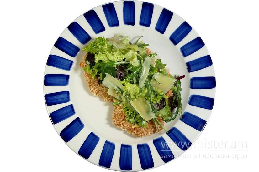 Філе курки, салат мікс, сир пармезан, соус до салату (яйця, анчоуси, гірчиця, вершки, лимон, часник, сир пармезан, олія соняшникова), борошно, яйця, сухарі панко.
