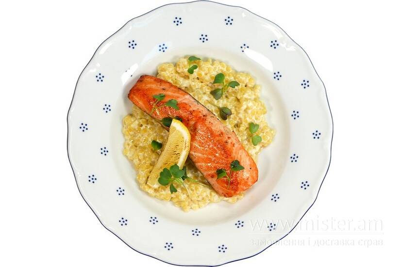 Філе лосося, кускус птітім, вершки, сир пармезан, лимон, мікрозелень.