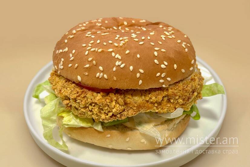 Хрусткий бургер із соковитим курячим філе в золотистій паніровці, приправленому паприкою та часником, у м’якій кунжутній булочці. Свіжий айсберг, стиглий помідор, вершковий сирний соус із чеддером та пікантний «Мустард» із пармезаном створюють вибух смаку!