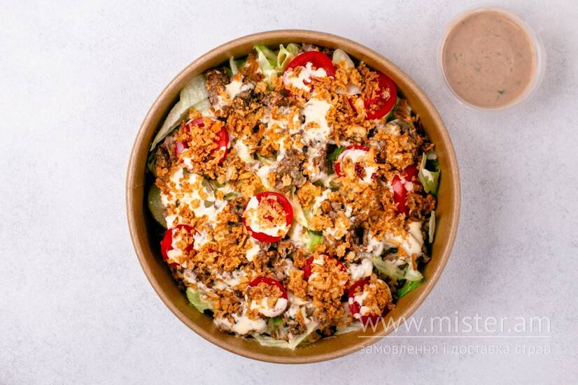 Соковита запечена яловичина з соусом барбекю, маринований огірок, листя айсбергу, сухарі, сирний соус та цибуля кранч. Всі улюблені смаки бургера в легкому, свіжому салаті.