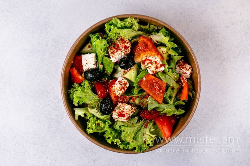 Мікс свіжого салату, соковиті чері, хрумкі огірки та болгарський перець, маслини й ніжна фета під ароматним соусом песто. Легкий, яскравий і дуже свіжий!